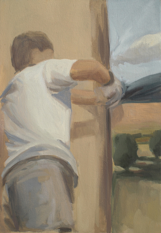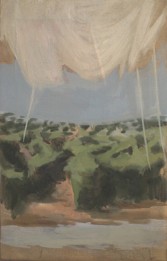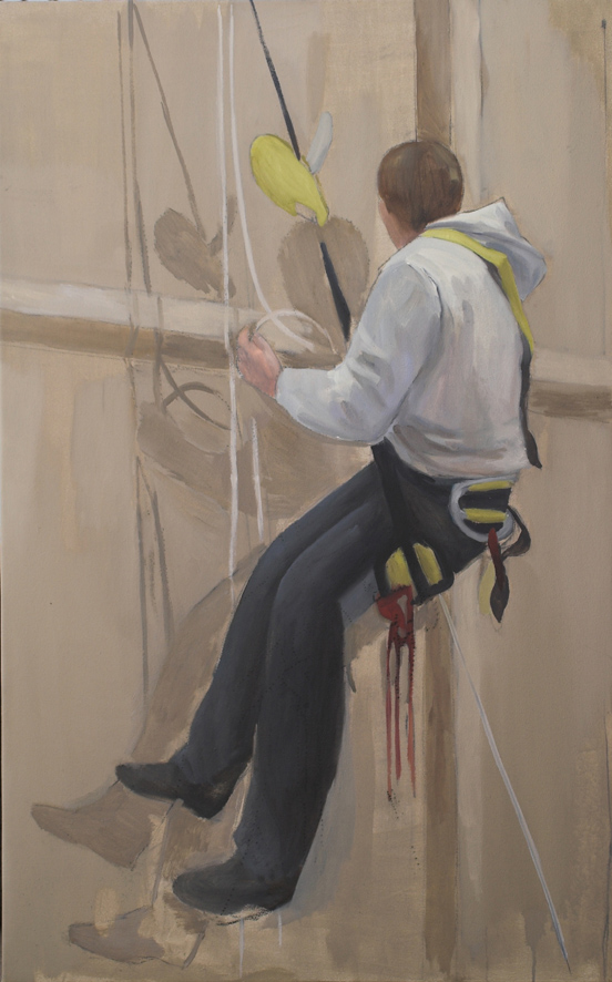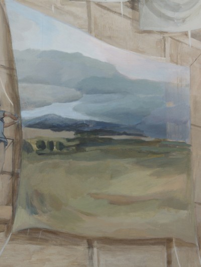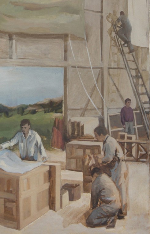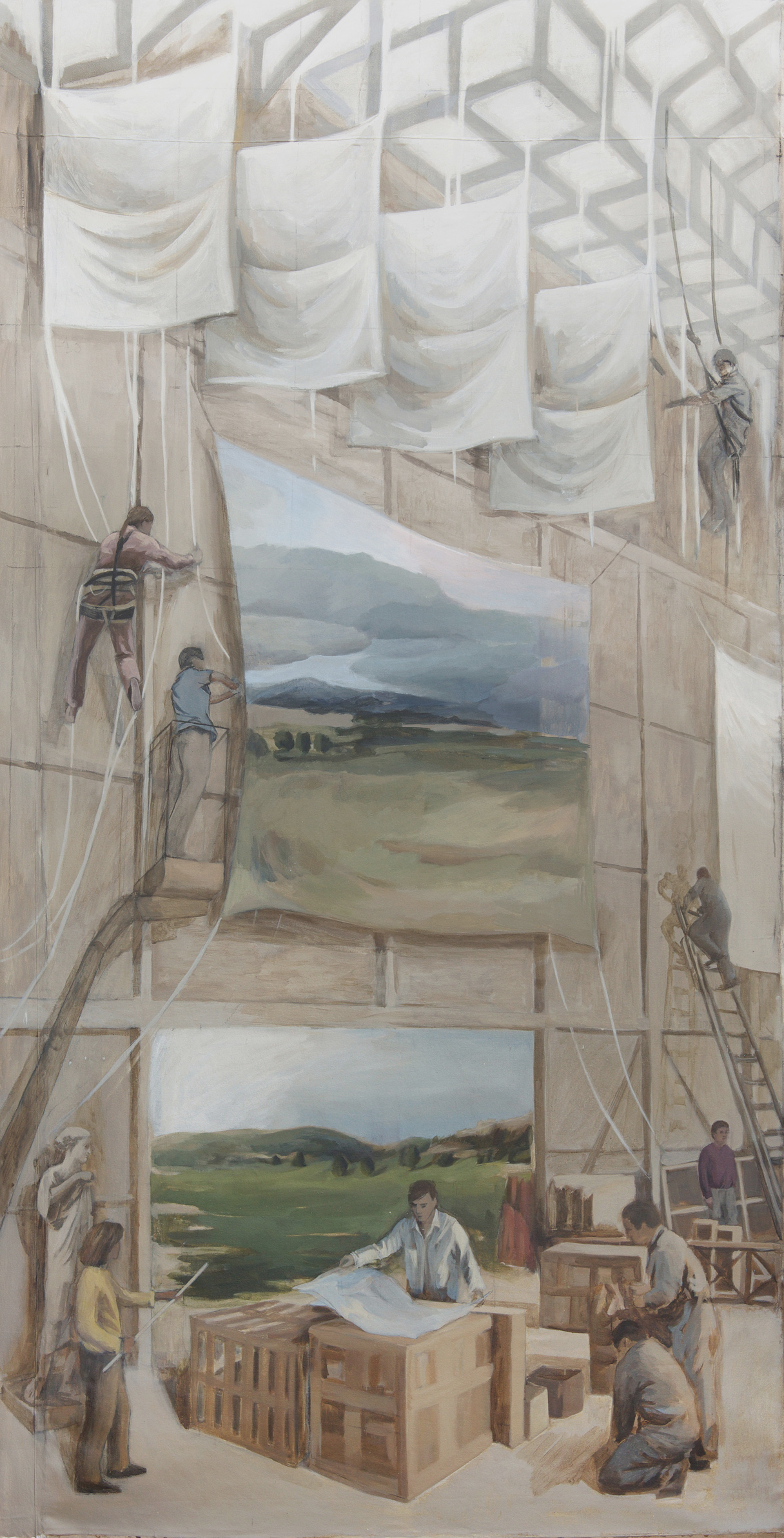 La Nave, (Boceto) 2009. Acrílico/lienzo 283 x 145 cm (Detalle)  (Detalle) Mujer trabajando, 2009. Óleo/lienzo 55 x 39 cm.  Paisaje y cortina, 2009. Óleo/lienzo 55 x 39 cm |